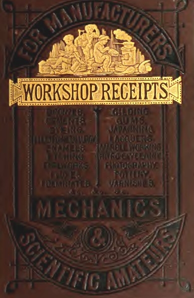 WORKSHOP RECEIPTS was compiled to effect three purposes; to serve as a note-book for the small manufacturer ; to supply the intelligent workman with information required to conduct a process foreign perhaps to his habitual labor. but which it is necessary to practice at the time; and impart to the scientific amateur a knowledge of many processes in the arts trades and manufactures which will it is hoped render his pursuits the more instructive and remunerating
